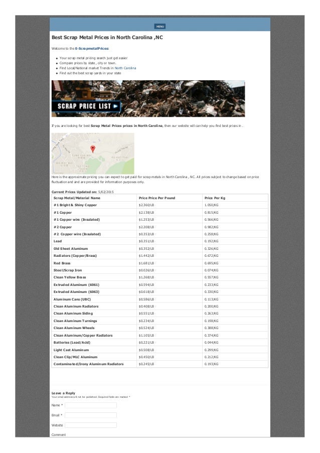 Scrap Metal Scrap Price Updated Price Date. 18 rows Scrap Metal Scrap Price Updated Price Date. Different scrap metal yards located in North Carolina can purchase and process different types of metal scraps.